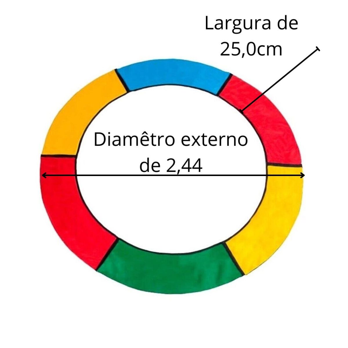 Protetor de MolasQue evita acidentes, porque ele tem a função de proteger as molas, ao proteger as molas evita que os pés afundem entre as molas durante o uso do brinquedo. A confecção do protetor de molas é feita com a Lona Vinil XP 500, um material impermeável e que possui proteção UV. Na parte interna utilizamos o Polipropileno Expandido. Reforçamos todas as emendas e as fitam que amarram são fitas elásticas. Nosso acabamento é multicolorido para deixar o brinquedo mais atrativo. As cores são: vermelho, amarelo, verde e azul. Altura: 2cm | Diâmetro: 2,44m | Peso: 2,5Kg |