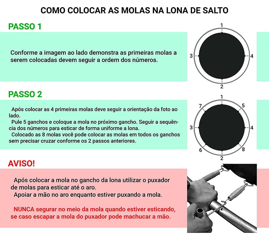 | Indicada para | Cama Elástica Nacional ou Importada de 3,05 metros que usa mola de 18,0cm |